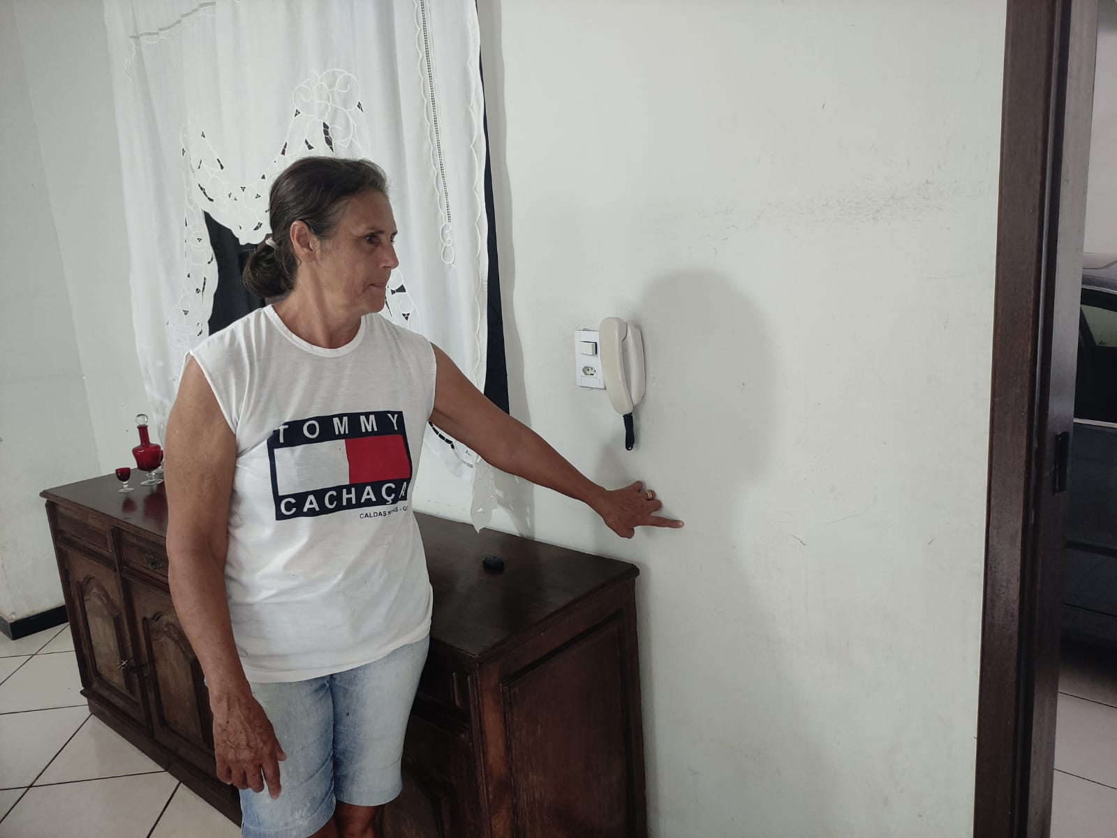 Maria de Fátima exibe a mancha da enchente de 2020, antes do atual Governo assumir a Prefeitura de Arcos