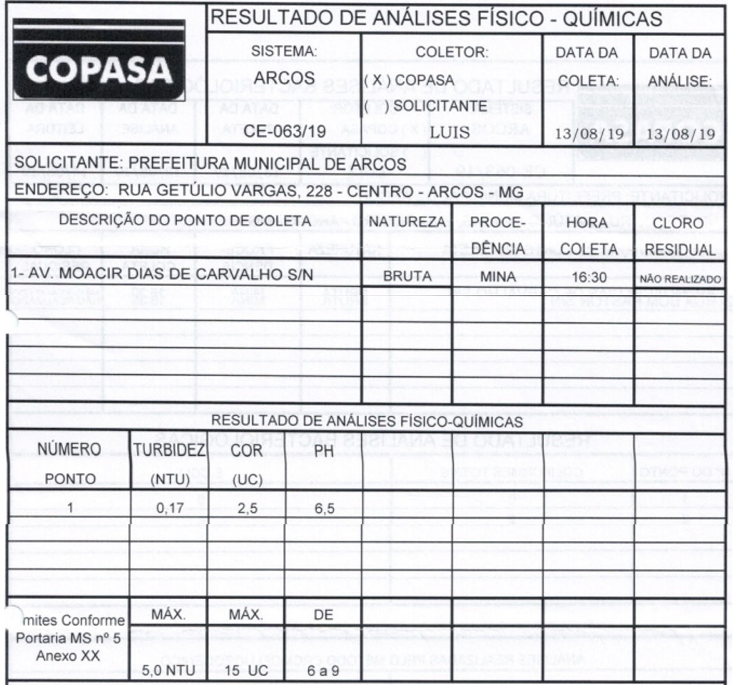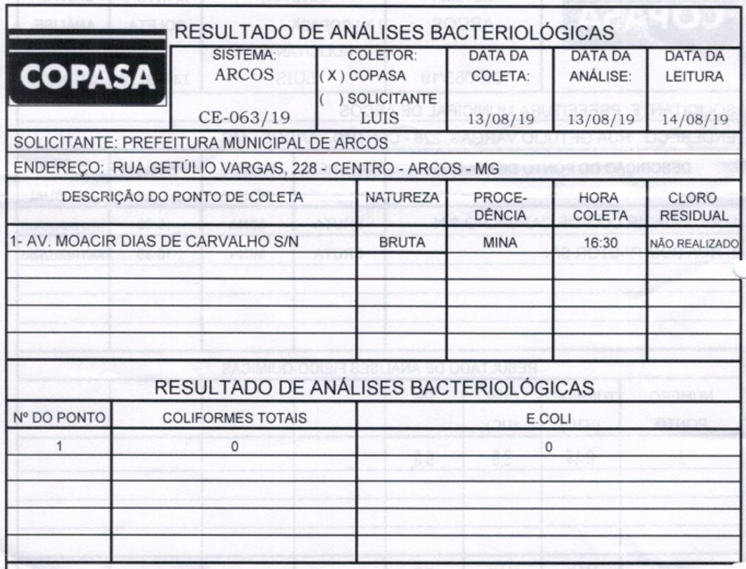 Para segurança da população, o Governo de Arcos enviou pedido à Copasa (Companhia de Saneamento de Minas Gerais) para que fizesse as análises bacteriológicas e físico-quimicas da mina d’água situada na Avenida Drº Moacir Dias de Carvalho (terreno do município). E os resultados chegaram nesta semana.