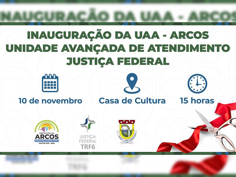 A Administração Municipal de Arcos convida toda a comunidade para a inauguração oficial da Unidade de Atendimento Avançado (UAA), que ocorrerá na próxima segunda-feira, dia 10 de novembro, a partir das 15 horas, na Casa de Cultura.