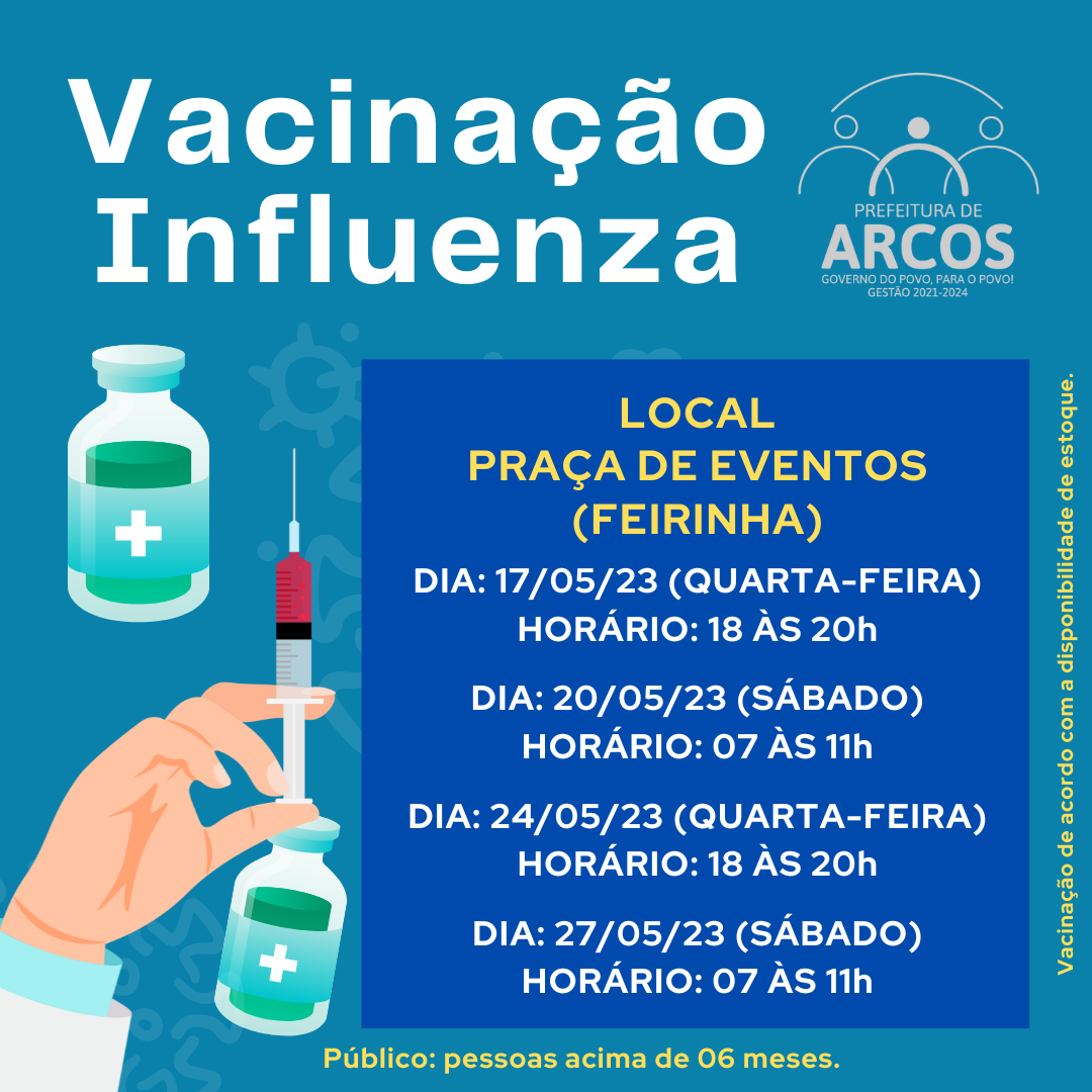A Secretaria Municipal de Saúde do município de Arcos, por meio do setor de Imunização, e com o auxílio de profissionais da Atenção Básica, irá intensificar a partir de hoje, 16, a vacinação contra a Influenza, o que permitirá, ao longo do respectivo ano, minimizar a carga e prevenir o surgimento de complicações decorrentes da doença, reduzindo os sintomas nos grupos prioritários, além de reduzir sobrecarga nos serviços de saúde.