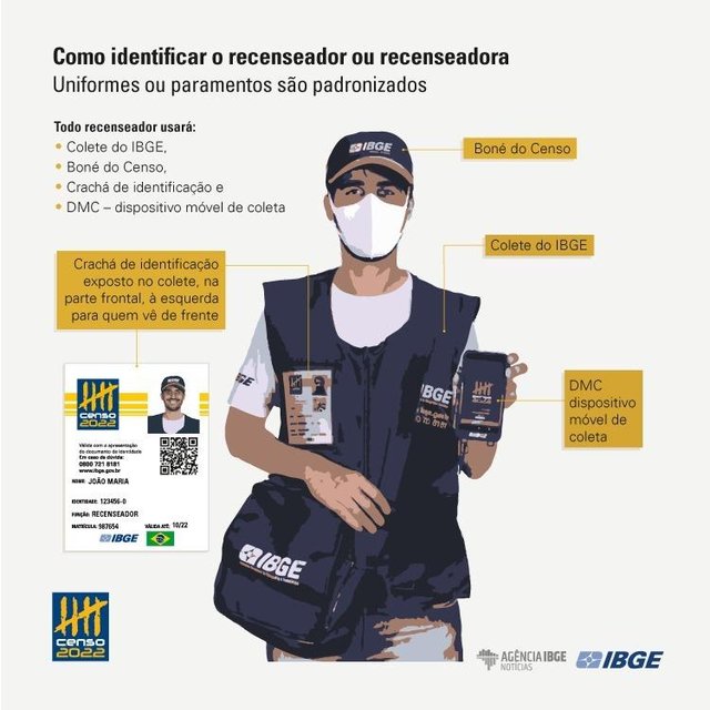 O recenseador deve se apresentar uniformizado com colete do IBGE, crachá de identificação com nome, RG, matrícula e QR Code (código de barras bidimensional que pode ser facilmente escaneado usando a maioria dos telefones celulares equipados com câmera). Além disso, deverá utilizar o Dispositivo Móvel de Coleta (DMC). O uso do boné é facultativo.