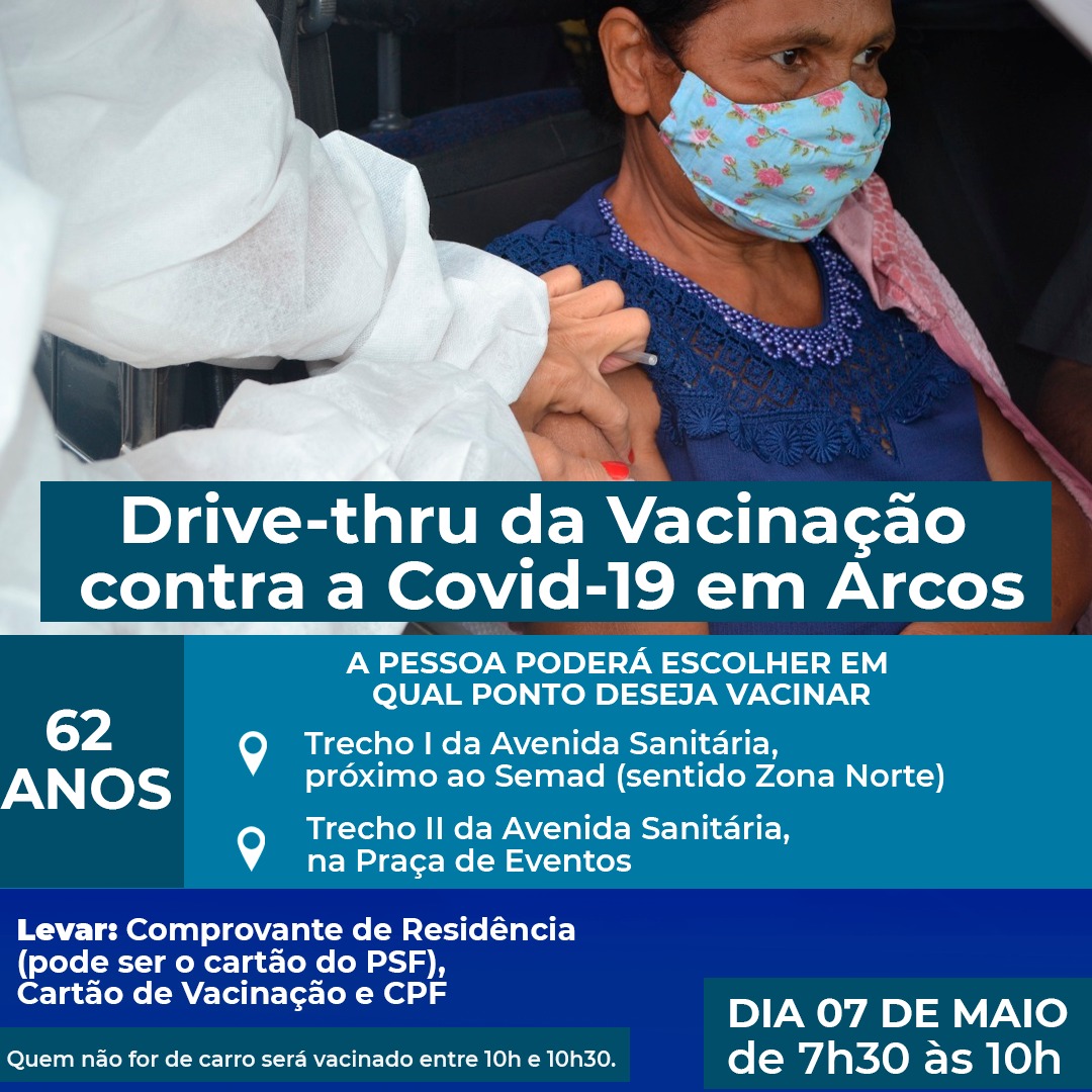 Os idosos de 62 anos receberão a primeira dose da vacina contra a Covid-19 nesta sexta-feira (07/05). O Drive-thru de Vacinação da Prefeitura Municipal de Arcos será das 7h30 às 10h, em dois pontos: Trecho I da Avenida Sanitária (próximo ao Semad, sentido Zona Norte) e Trecho II da Avenida Sanitária (Praça de Eventos). O idoso pode escolher em qual ponto deseja se vacinar.