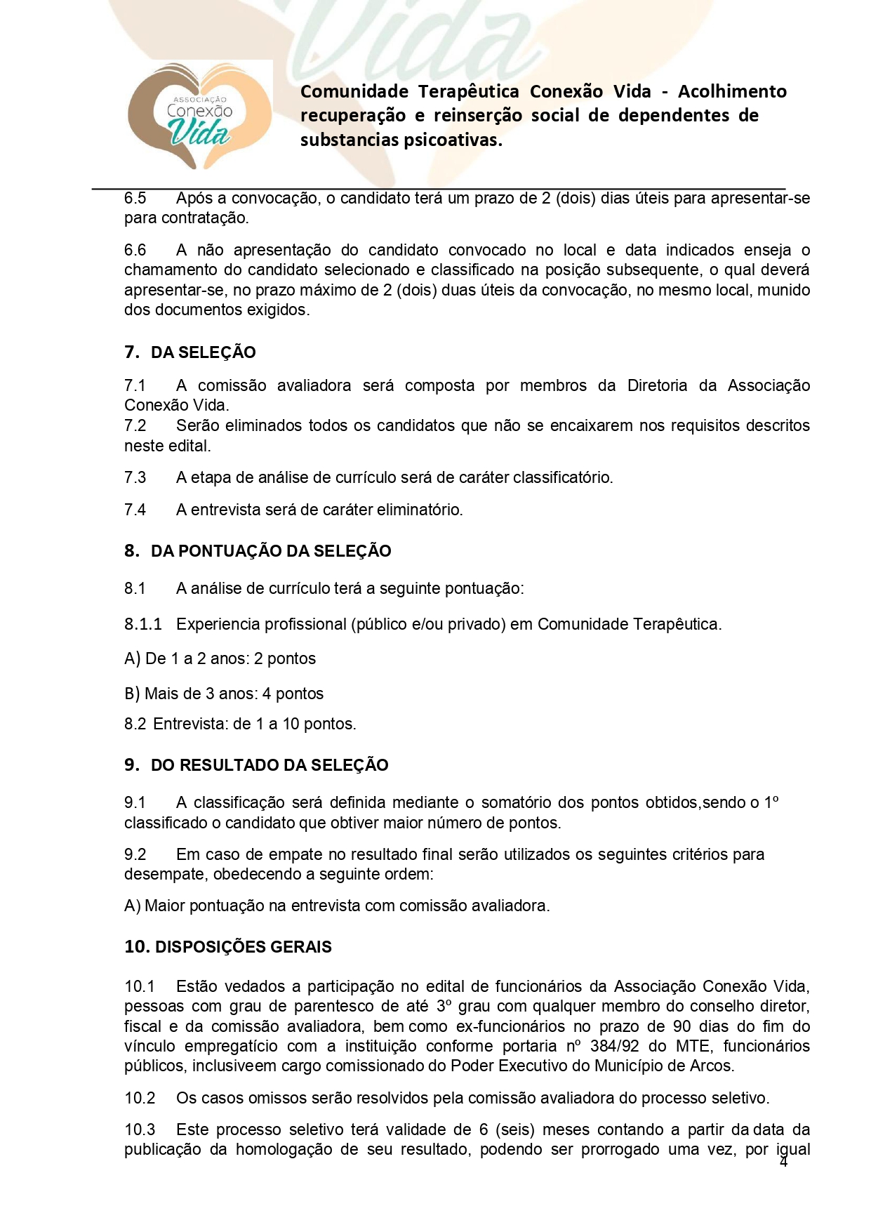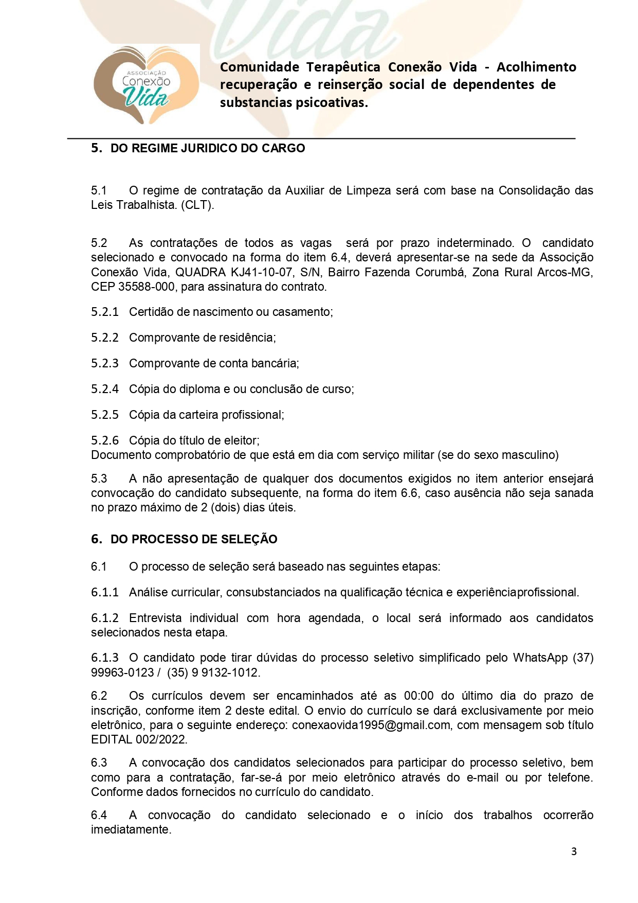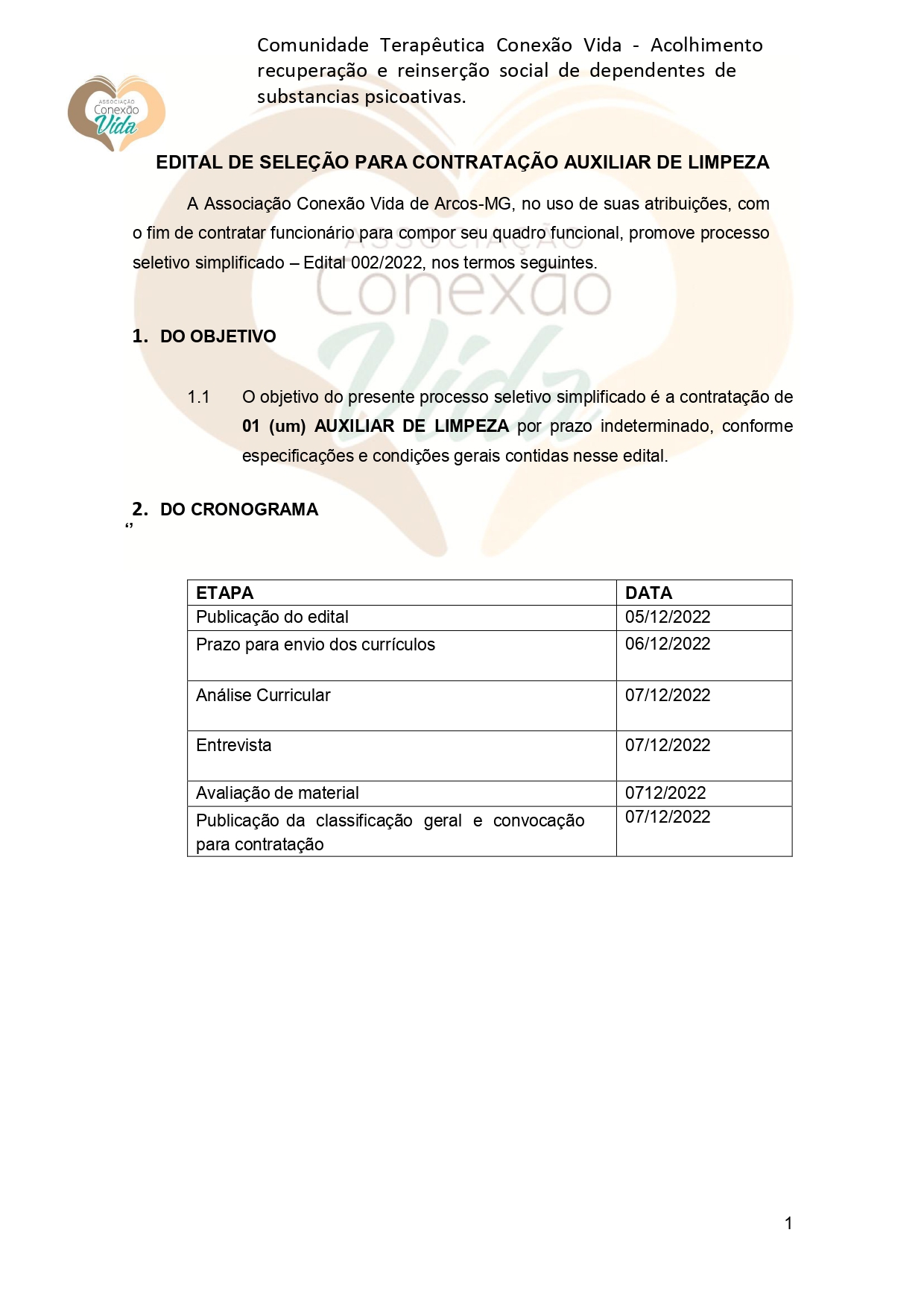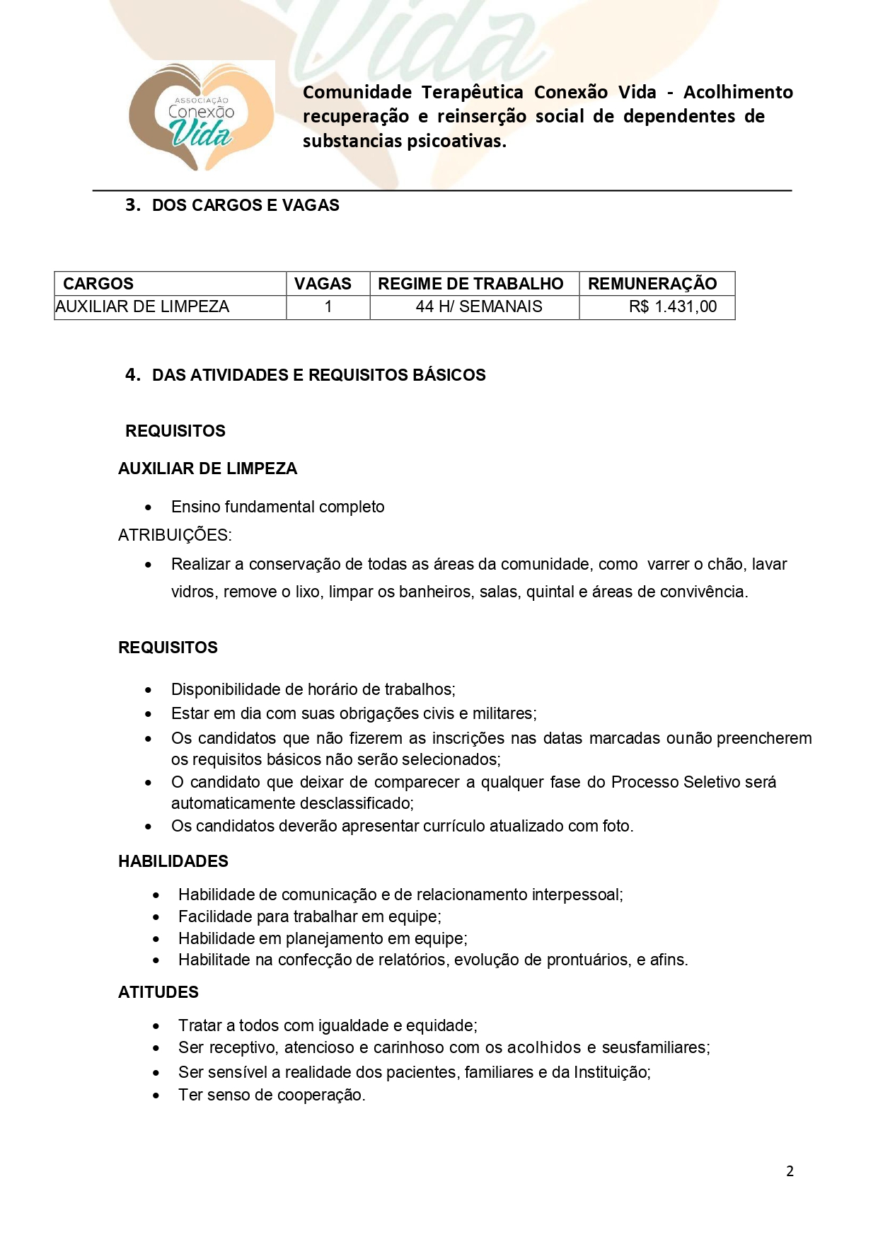 Conexão Vida: edital de seleção para contratação de Auxiliar de Limpeza