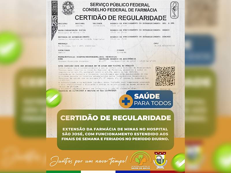 Pensando em oferecer mais conforto e agilidade no atendimento, a Prefeitura de Arcos leva a farmácia para o Hospital São José, nos finais de semana e feriados, no período diurno.