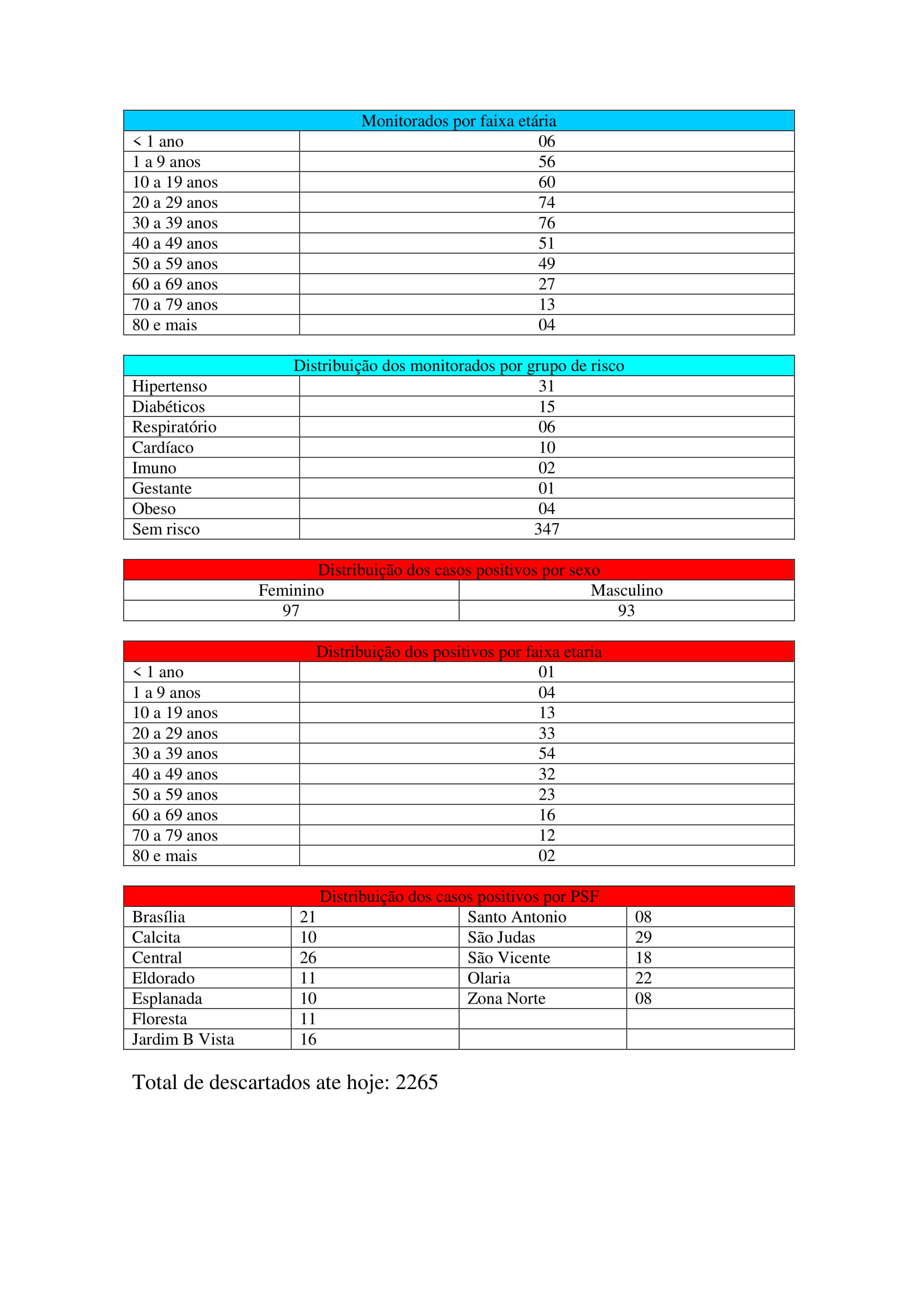 O boletim ainda traz os seguintes números: 416 pessoas estão monitoradas (211 homens e 205 mulheres); 190 positivos (sendo 144 recuperados, 37 isolados,06 internados e 03 óbitos).