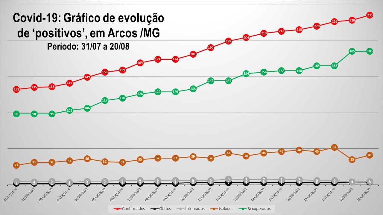 O boletim arcoense Covid-19 aponta no dia de hoje, 20 de agosto, a positividade de mais 07 pessoas.