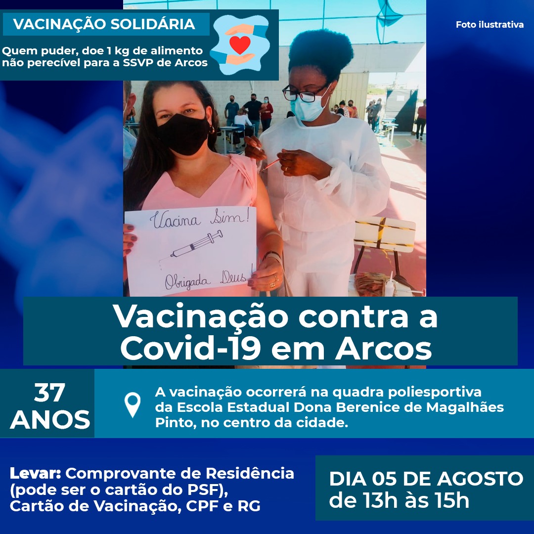 Quinta-feira, 05 de agosto, de 13h às 15h, acontece em Arcos a vacinação contra a Covid-19 para pessoas de 37 anos.