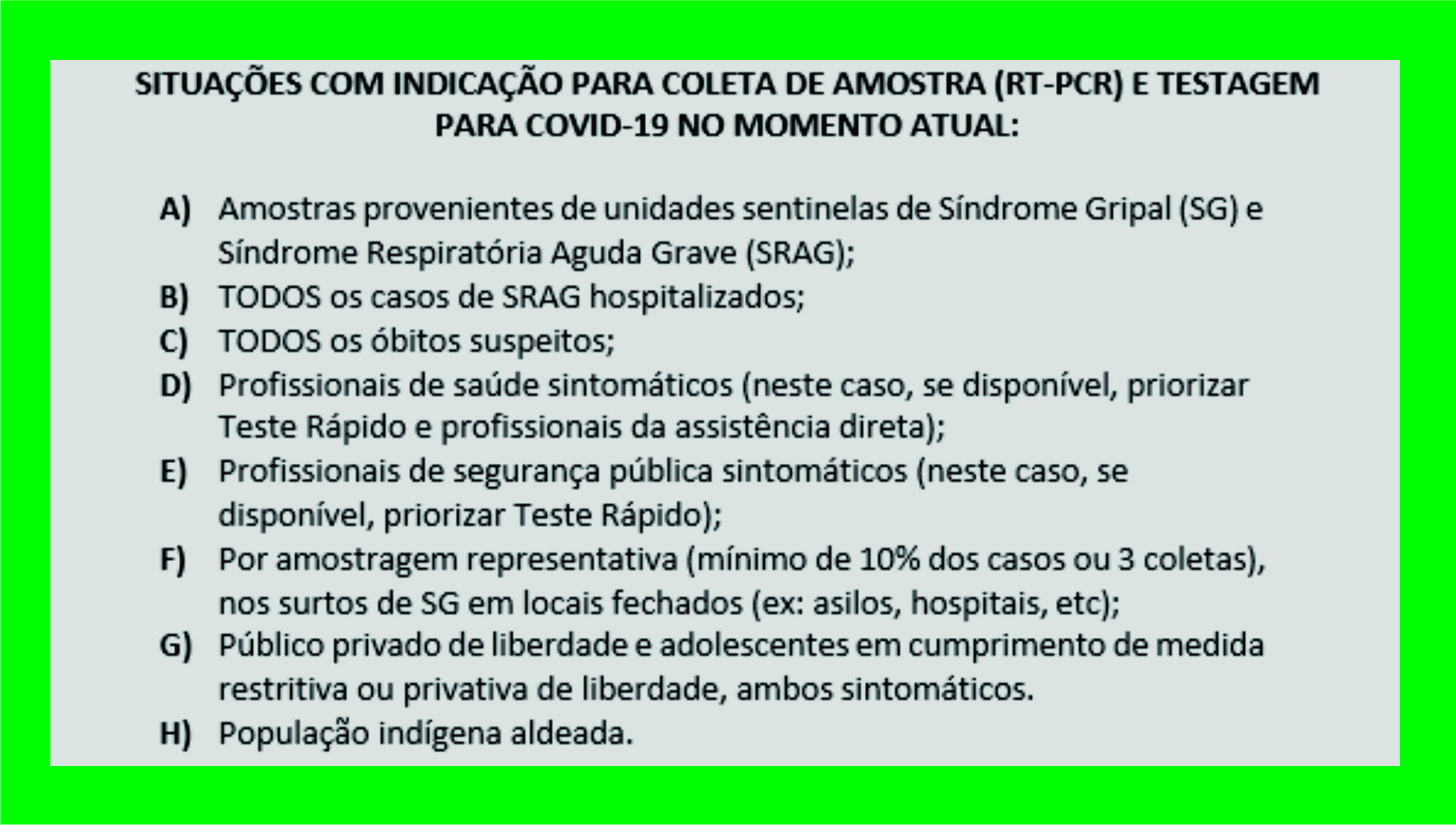 De acordo com o protocolo do Ministério da Saúde, recomenda-se que tais testes sejam realizados em indivíduos que apresentem ou tenham tido os sintomas da Covid-19, há pelo menos oito dias. Os testes RT-PCR devem ser utilizados quando houver sintomatologia compatível ou houver necessidade de confirmação da infecção.