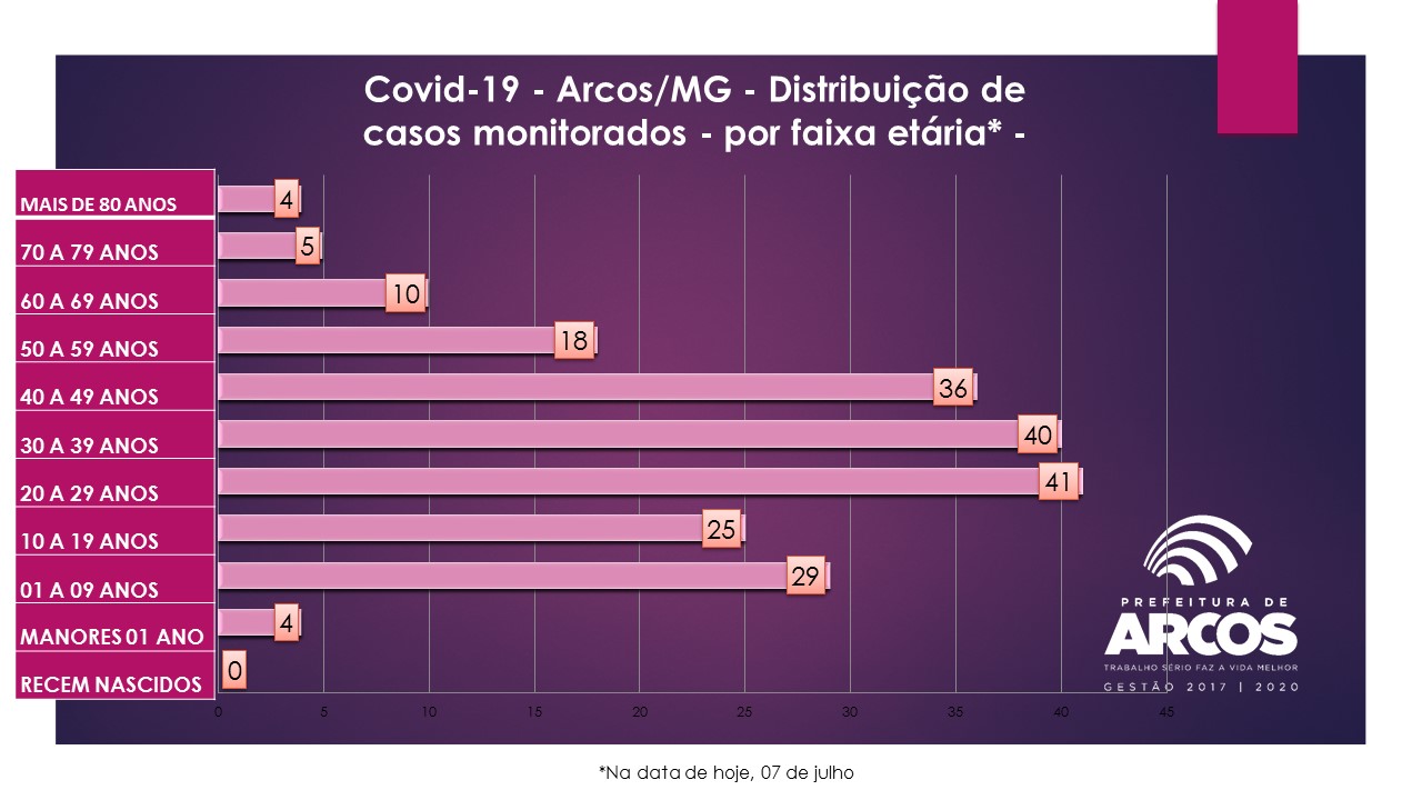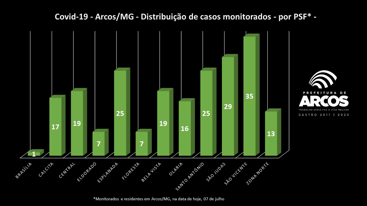 Dados gerais apontam que, em 07 de julho de 2020, 212 casos estão sendo monitorados; 63 casos confirmados de residentes em Arcos (sendo: 01 internado, 12 em isolamento, 49 recuperados e 01 óbito), além de 1.255 casos descartados; o que totaliza 1.530 casos.