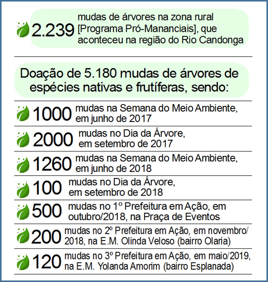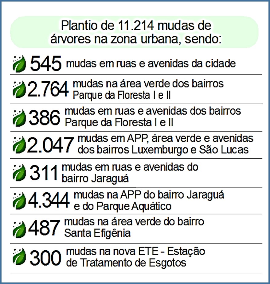 Veja abaixo um balanço das ações da Secretaria de Meio Ambiente, no tocante ao plantio de mudas de árvores na cidade.
