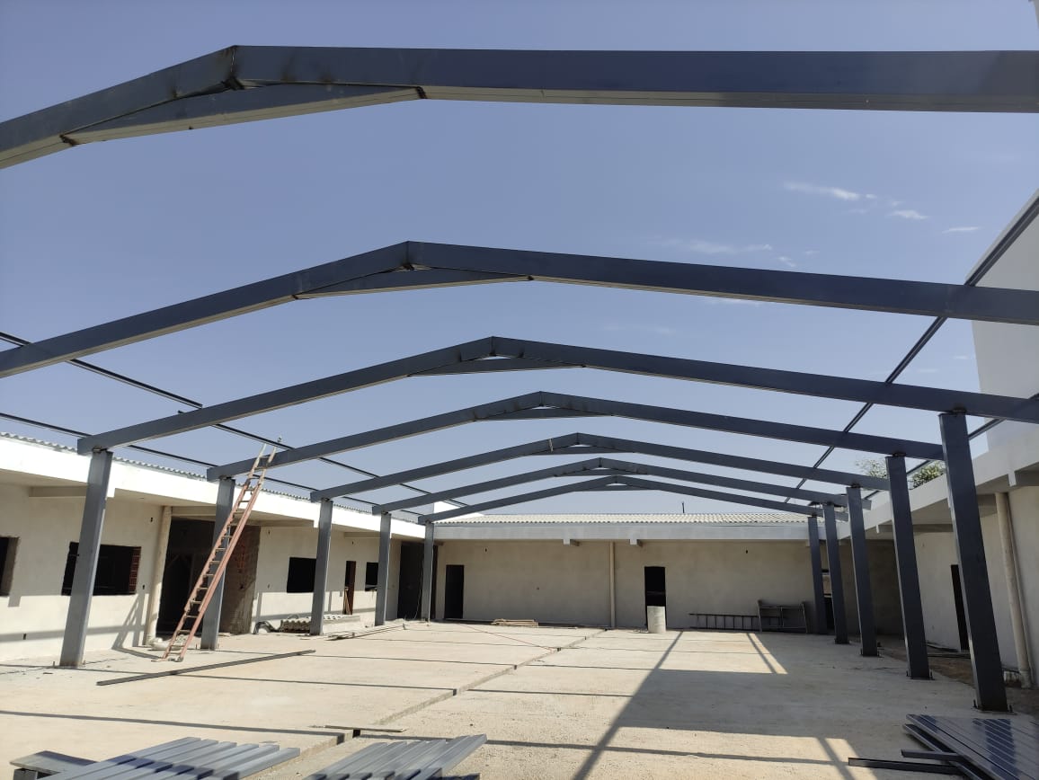 O prédio já teve a laje batida e foi coberto com telhas. A estrutura metálica do pátio também está instalada e todo trabalho já caminha para a fase de acabamento.