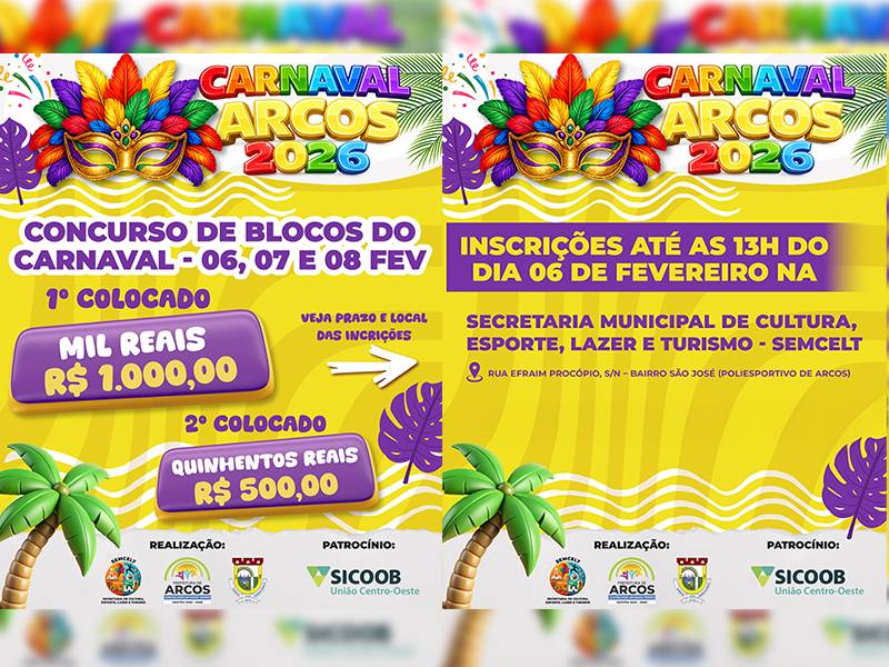 Concurso de Blocos do Pré-Carnaval de Arcos será realizado nos dias 06, 07 e 08 de fevereiro