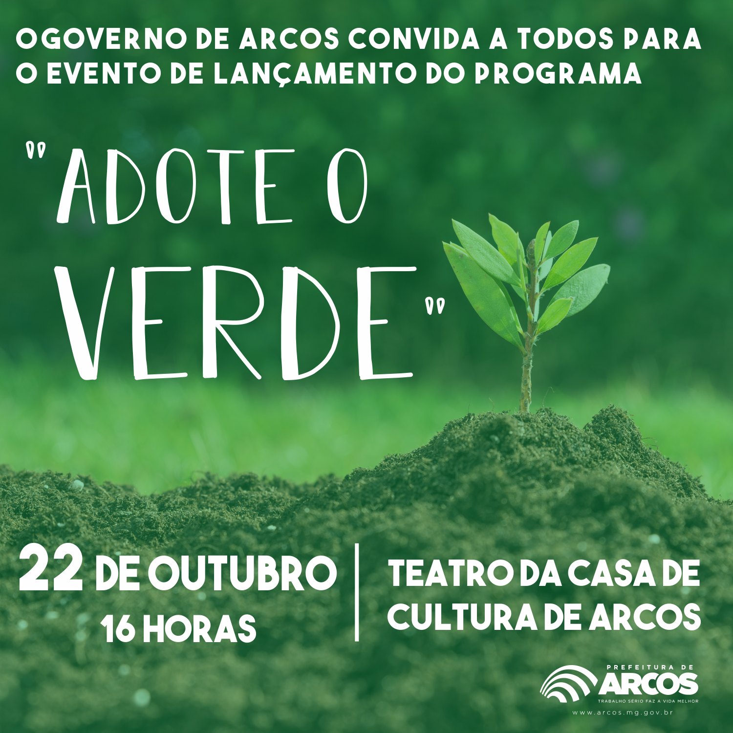 O Governo de Arcos (através da Secretarias de Meio Ambiente e Agricultura e de Obras e Serviços Públicos) convida para o lançamento do evento ‘ADOTE O VERDE’, que acontecerá no dia 22 de outubro, às 16hs, no teatro da Casa de Cultura. Este projeto é destinado às empresas privadas e entidades não governamentais, legalmente constituídas, interessadas em reformar ou manter áreas públicas, assim entendidas - praças, canteiros, jardins e outras áreas passíveis de ajardinamento.