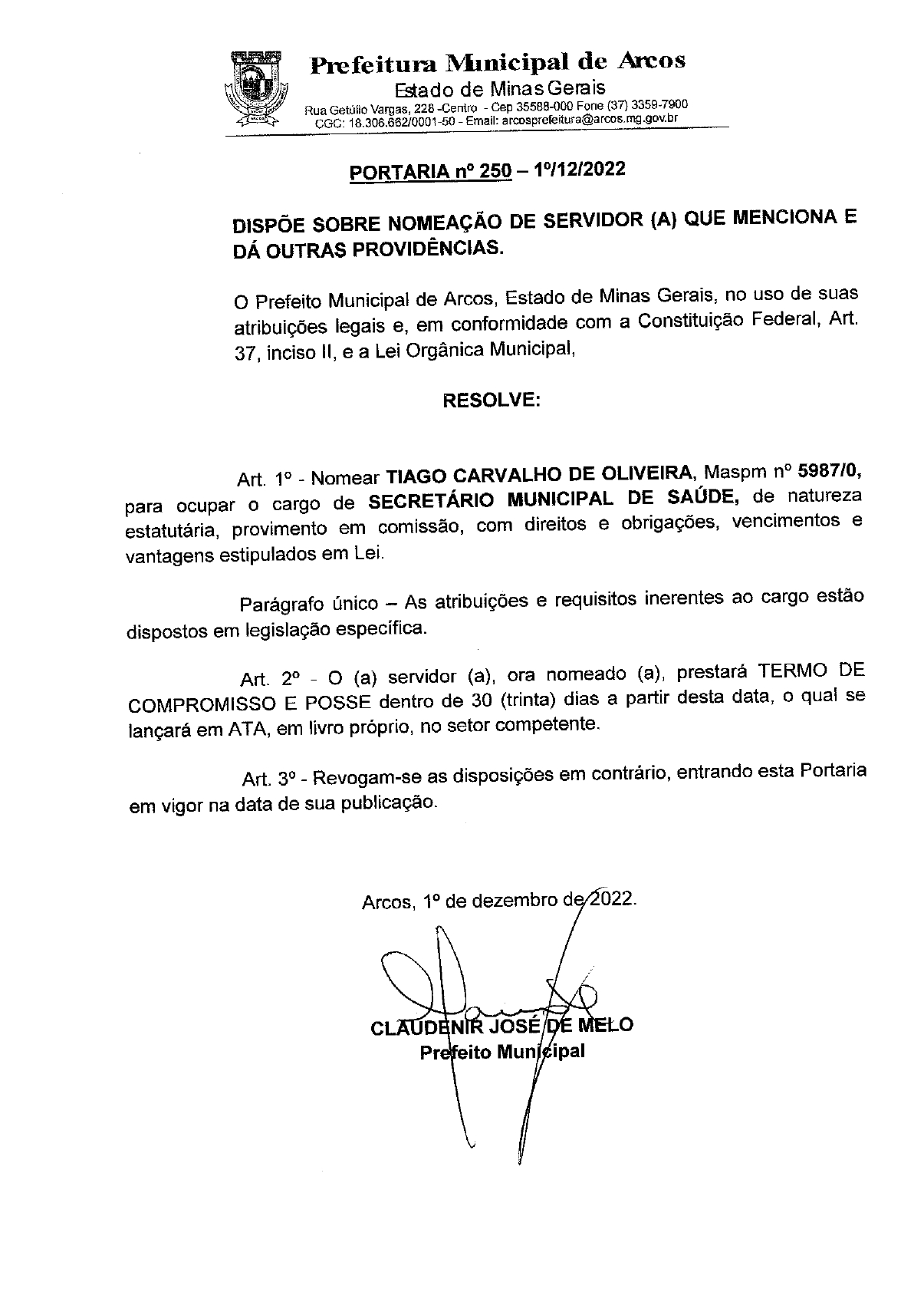 A Prefeitura de Arcos anuncia, oficialmente, que Tiago Carvalho de Oliveira assume a Secretaria Municipal de Saúde, em substituição à servidora Adalgisa Borges.
