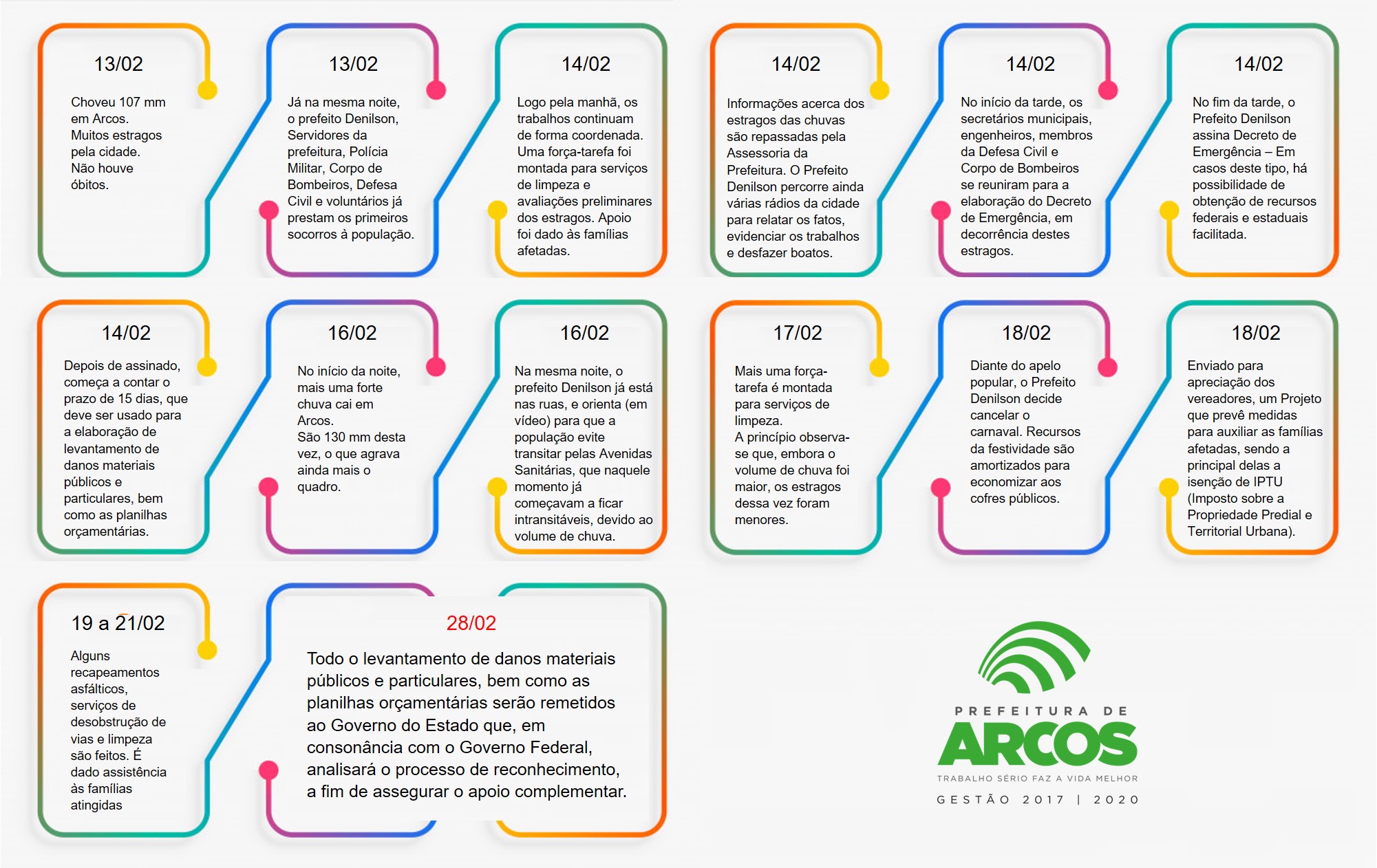 A Prefeitura de Arcos, por meio das Secretarias de ‘Obras’ e ‘Planejamento’, esclarece que cumpre corretamente os prazos estabelecidos pela assinatura do Decreto de Emergência, o qual foi assinado pelo prefeito Denilson Teixeira, no dia 14/02, em virtude dos estragos causados pelas fortes chuvas dos dias 13 e 16 de fevereiro.