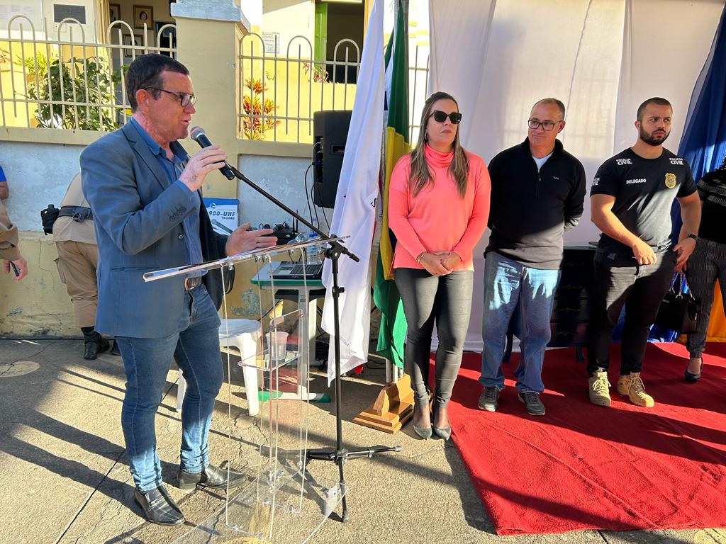 A viatura foi comprada por meio de emenda parlamentar do deputado Antônio Carlos Arantes, e entregue à Polícia Militar hoje (6), em uma cerimônia realizada na porta da Escola Estadual “Yolanda Jovino Vaz’, no centro.