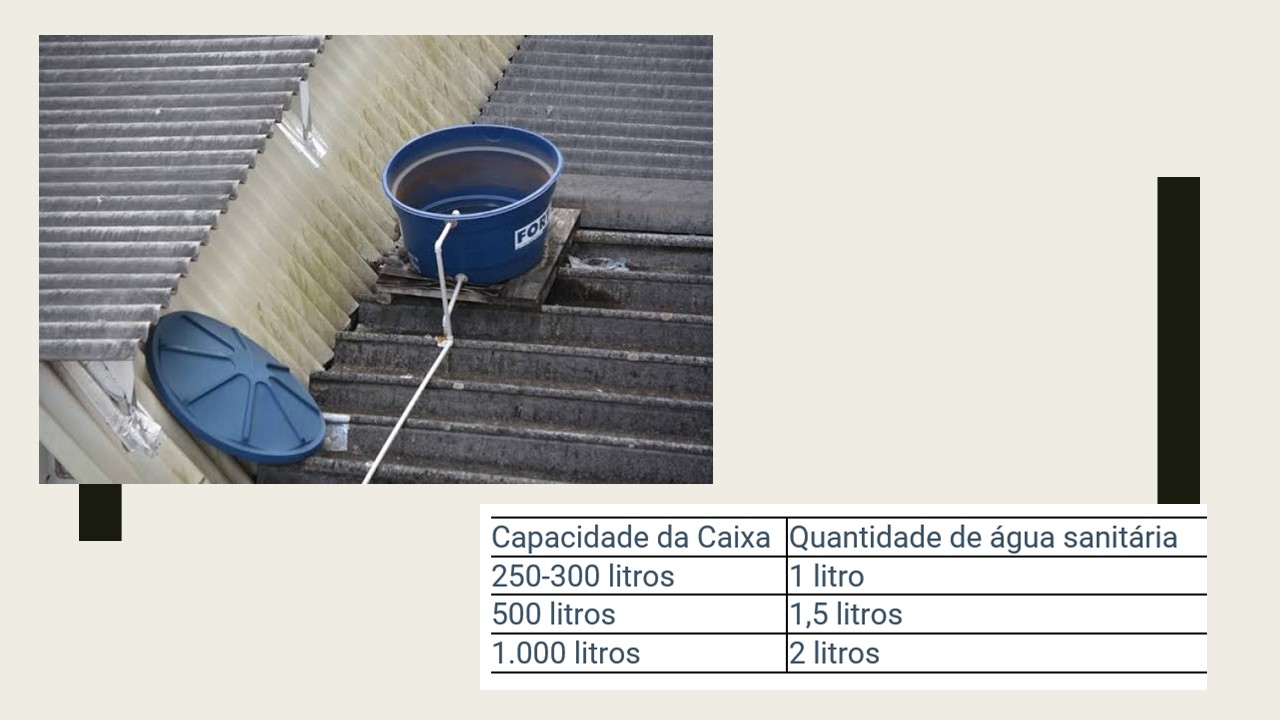 Neste contexto, a caixa d’água se torna um dos principais criadouros do mosquito se não estiver devidamente tampada e limpa. Um reservatório domiciliar limpo, ajuda a manter a qualidade da água distribuída.
