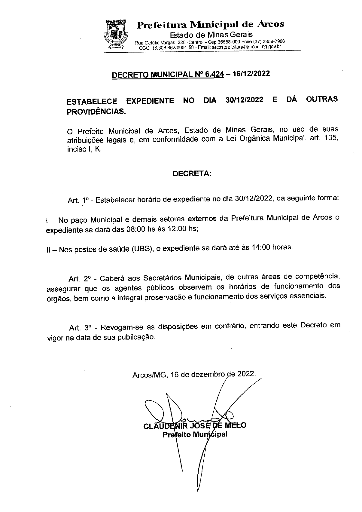 A Prefeitura de Arcos, por meio do Decreto 6.424, informa que na próxima sexta-feira (30), o expediente de trabalho no paço municipal e demais setores externos será de 8 às 12h. E nos Postos de Saúde da Família se dará até as 14h.