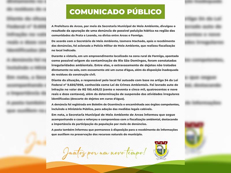 Prefeitura emite comunicado sobre contaminação no Rio São Domingos