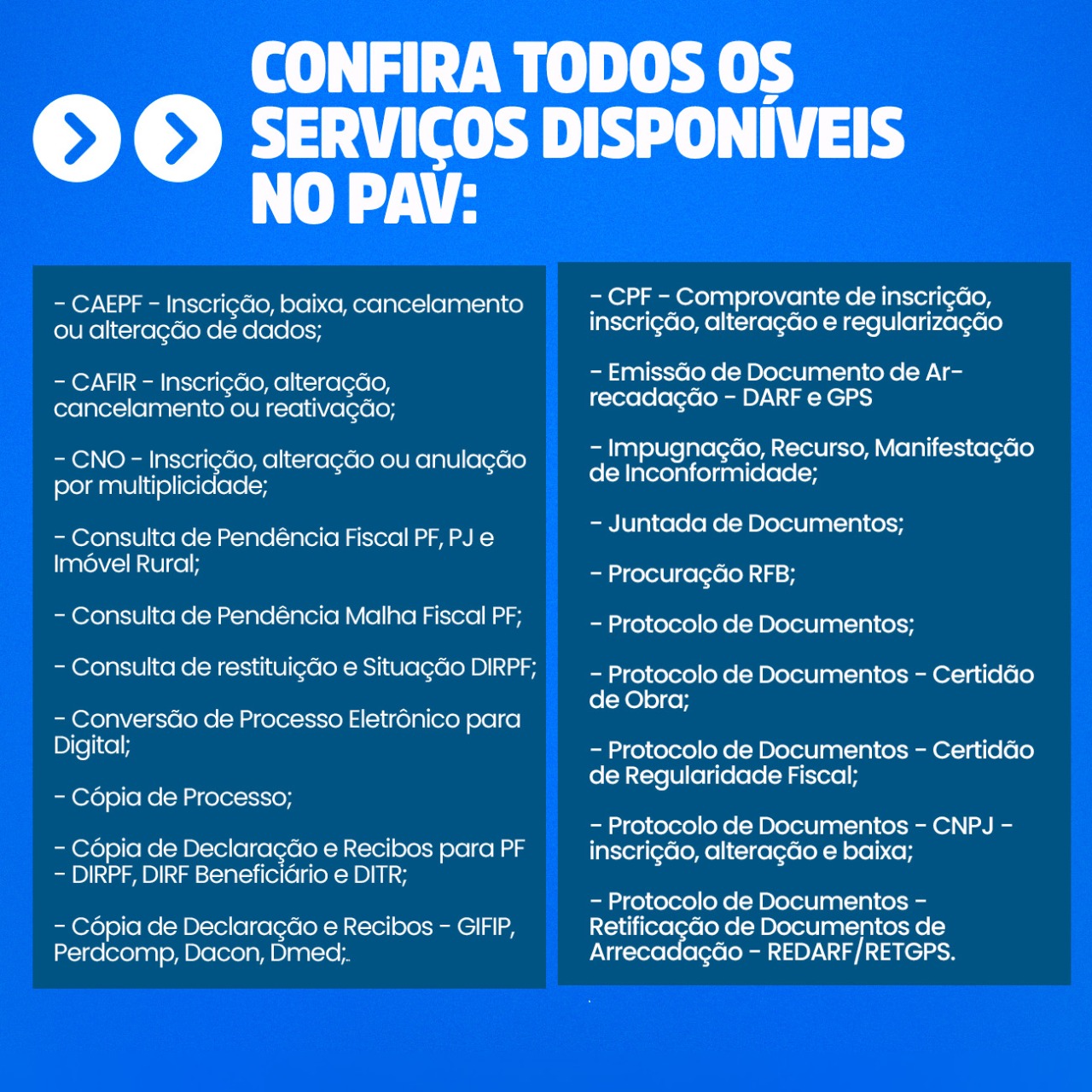 Cerca de 30 km separavam a população de Arcos dos serviços oferecidos pela Receita Federal. Isso porque a unidade mais próxima ficava na cidade de Formiga. Ciente da dificuldade de acesso que muitos munícipes enfrentavam, a Prefeitura fez uma parceria com a Receita Federal para a implantação do Ponto de Atendimento Virtual (PAV). As atividades serão iniciadas nesta segunda-feira (8) no Poupa Tempo (Praça Floriano Peixoto, 130 - centro).