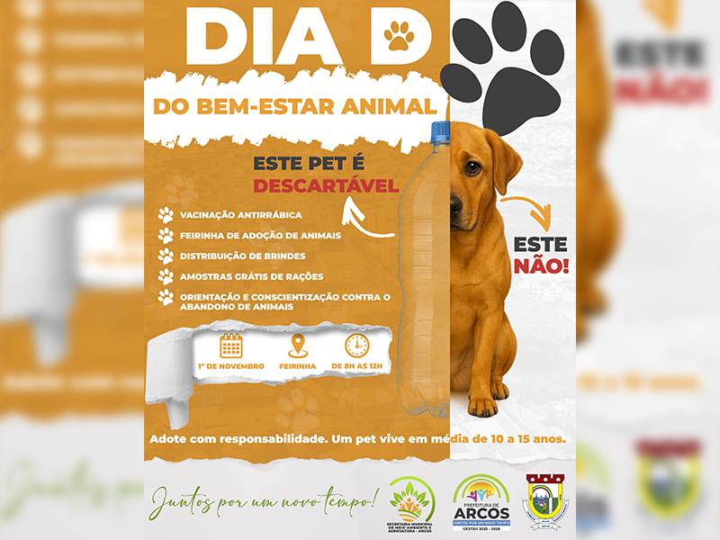 A Prefeitura de Arcos, por meio do Setor de Zoonoses e Secretaria de Meio Ambiente e Agricultura, realizará no próximo sábado, dia 1º de novembro, o Dia D do Bem-Estar Animal.