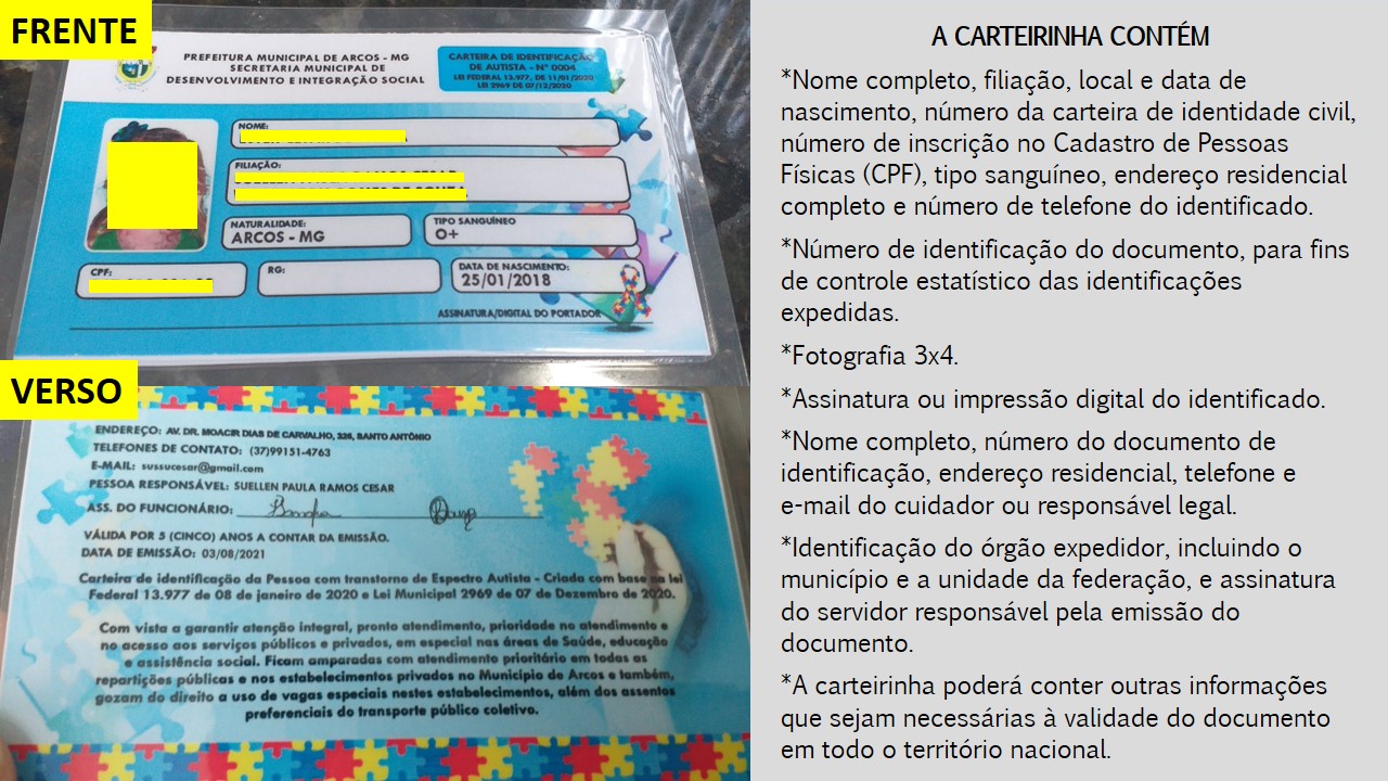 Embasada pela Lei Municipal 2.969/20 que a instituiu, a carteirinha é um grande avanço de inclusão social em Arcos, destinada a identificar a pessoa diagnosticada com o espectro autista. Sem custos para o requerente, é emitida pela Secretaria Municipal de Integração Social.