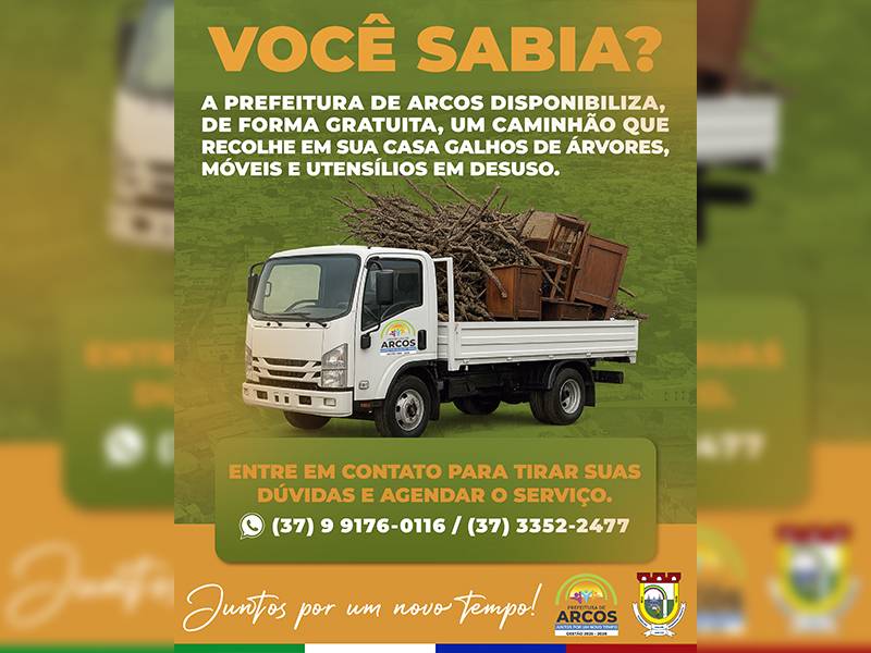 A Prefeitura de Arcos, por meio da Secretaria Municipal de Meio Ambiente, disponibiliza para a população o serviço de "cata-treco".