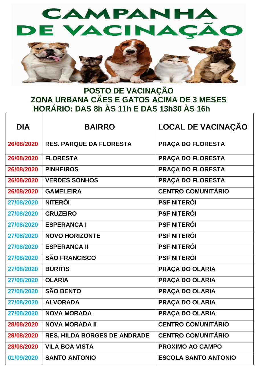 A Secretaria de Saúde, por meio do Centro de Controle de Zoonose divulgou nesta terça-feira, 25, a Programação da Campanha de Vacinação Antirrábica de Cães e Gatos, que acontece do dia 26/08/2020 ao dia 10/09/2020.